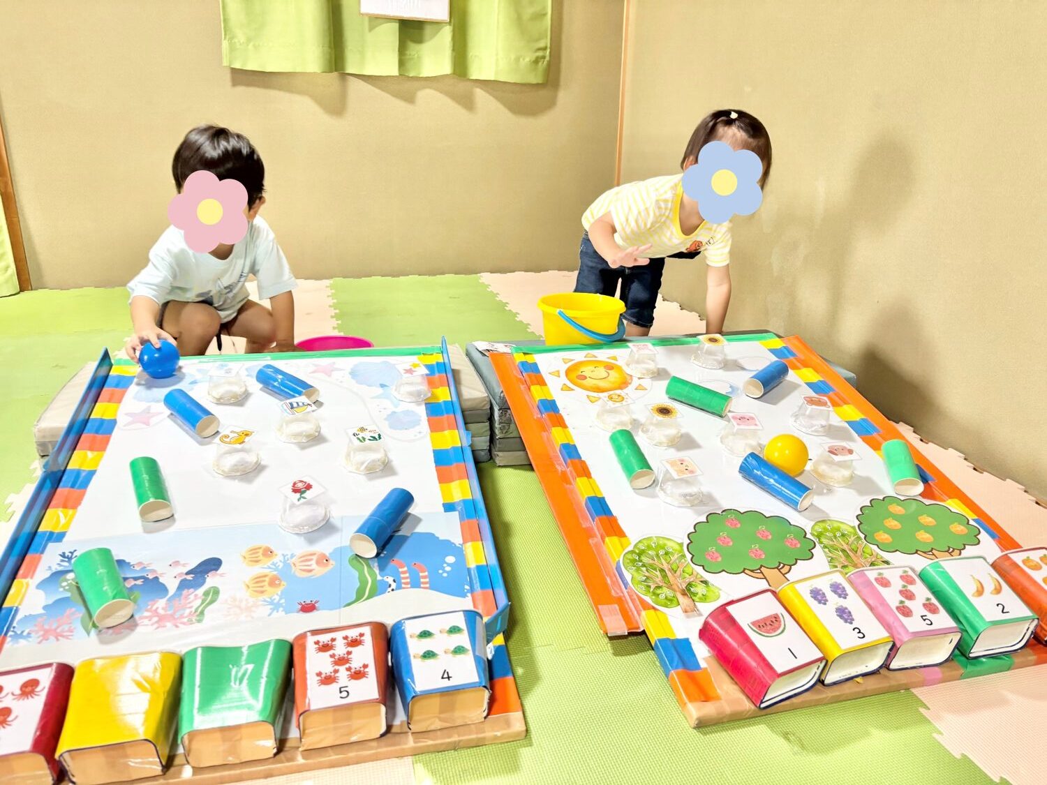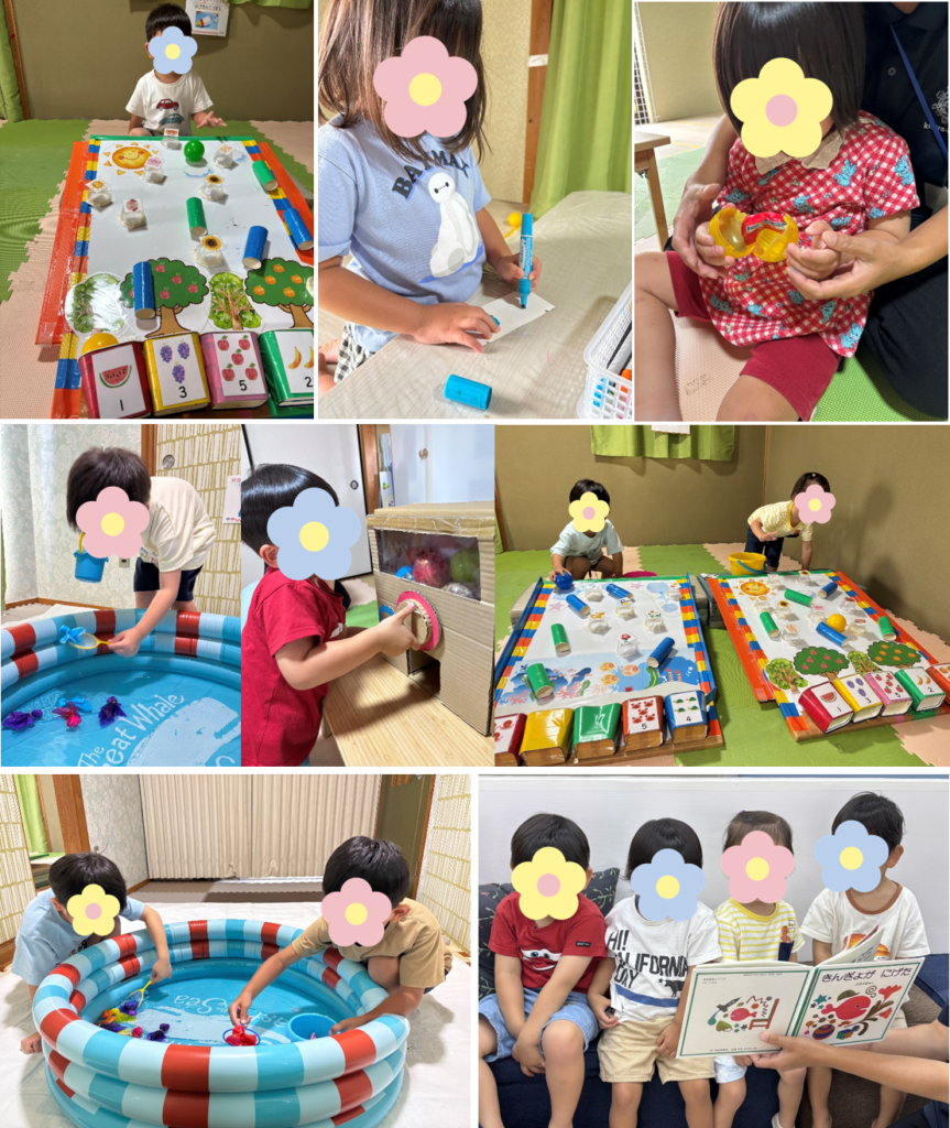 にこにこコースでは、手作りおもちゃを作ったり金魚すくいをしたりして、なつまつりを楽しみました。職員手作りのガチャガチャマシーンの中身はおやつになっていて、手首をひねってガチャガチャを回し、どんなおやつかワクワクしながら指先を使ってカプセルを開けて楽しむ姿が見られました。金魚すくいでは「3つ、とってね」と数の練習をしたり、「あか、とった!」「ぼく青がいい!」など色を楽しみながら、夏らしいあそびを堪能しました。