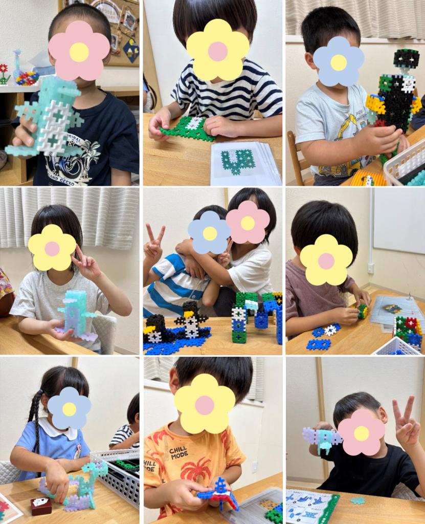 なかよしコースの子どもたちに人気のおもちゃ、カーペンターブロックで遊びました。見本をよく見ながらその色と形をマッチングさせ作り進める子もいれば、 「ペンギンは黒だよ」 「私はクリスタルにする!」と自分たちでイメージを広げながら色を選んだり、「ここを繋げたらどうなる…?」「どの色にしたら回した時に綺麗かな?」と見本に無いものも試行錯誤しながら作ったりと、それぞれに想像を膨らませながら集中して楽しむ姿が見られました。