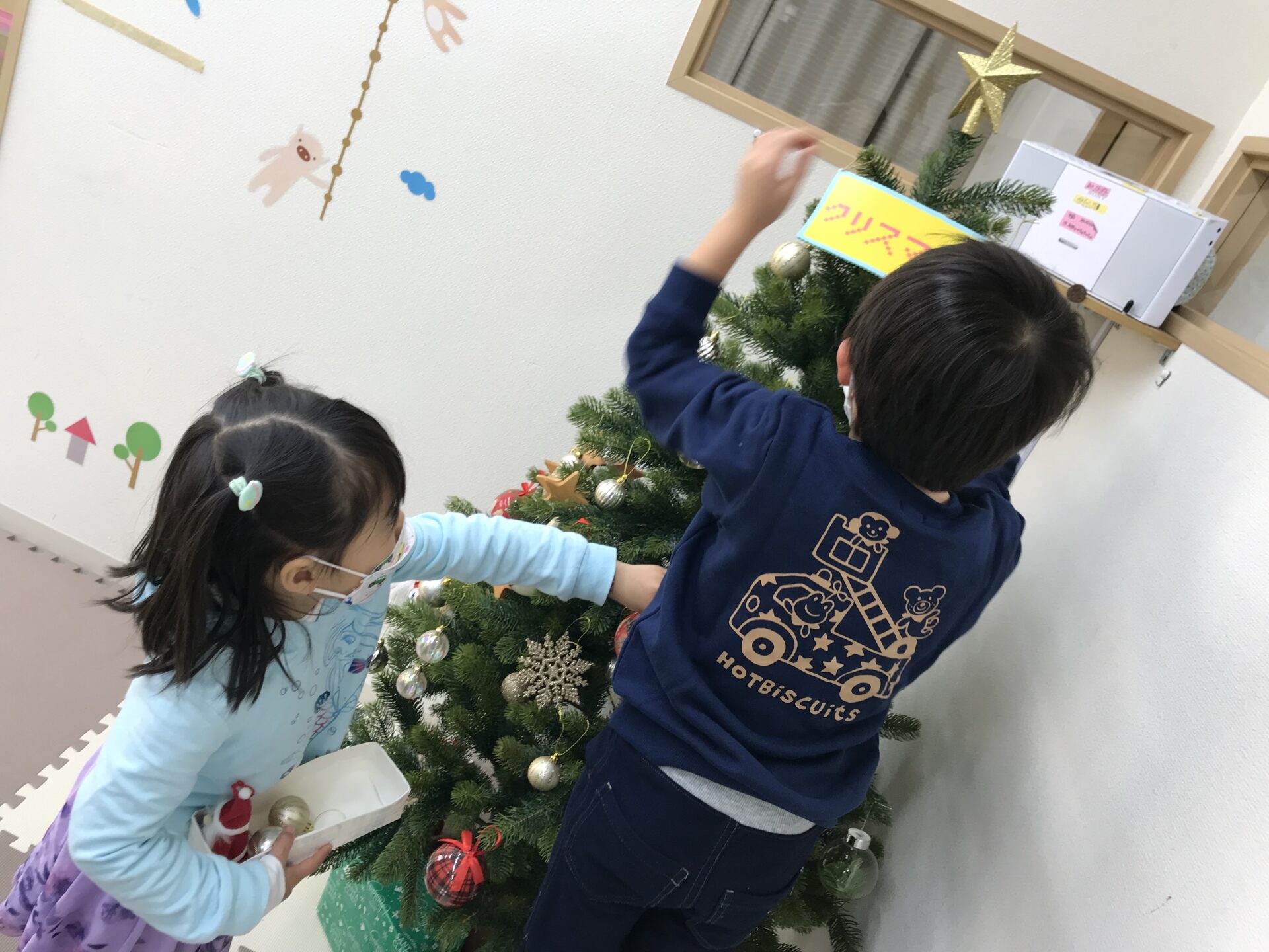 クリスマスツリーの飾りつけを子どもたちと一緒にしました。