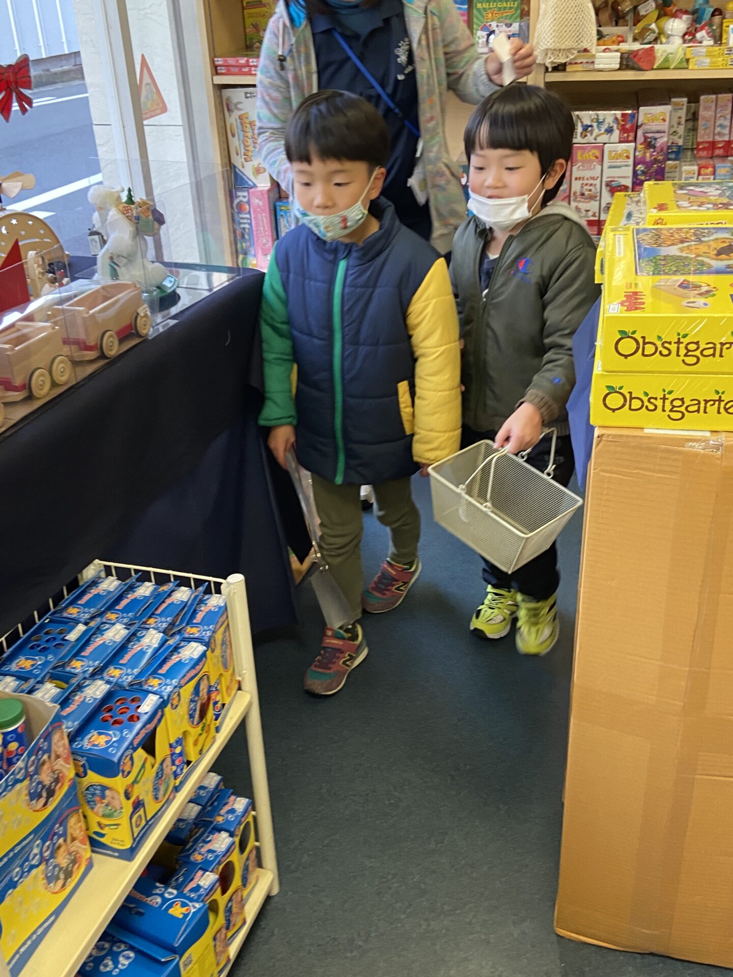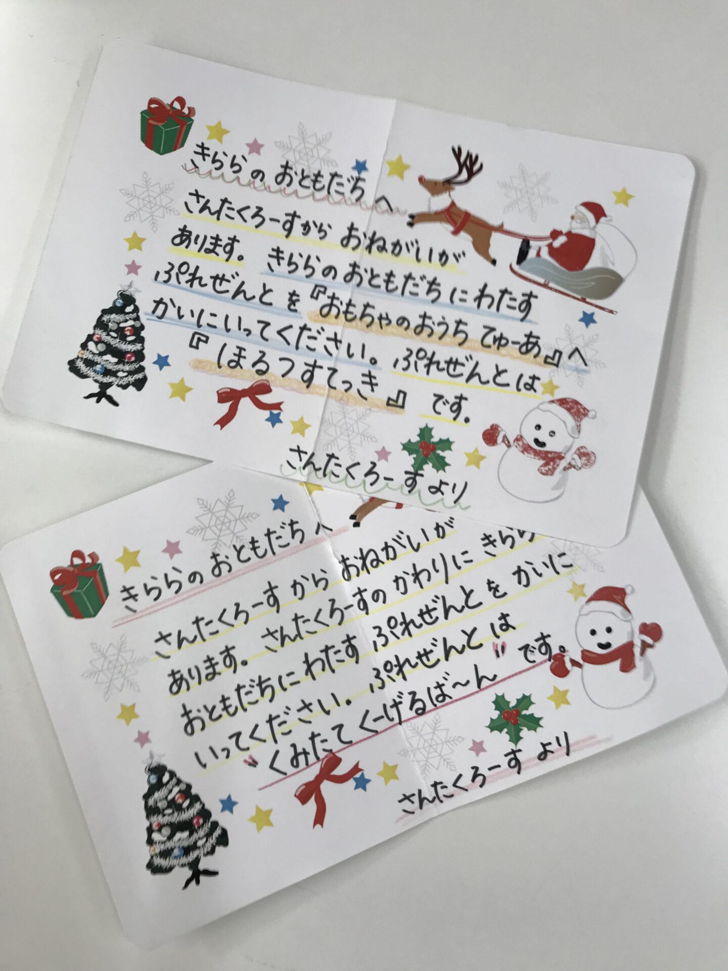 今年はサンタさんからきららの年長のお友達に手紙が届き「サンタさんは忙しいのできららのみんなに渡すプレゼントを代わりに買ってきてください」とお買い物を頼まれました。お店に着くと手紙を見ながら「これかな?」と頼まれたプレゼントを友達と話しながら探したり、お店の人に「〇〇ください」と言って実際にお金を渡してお買い物の体験をしました。