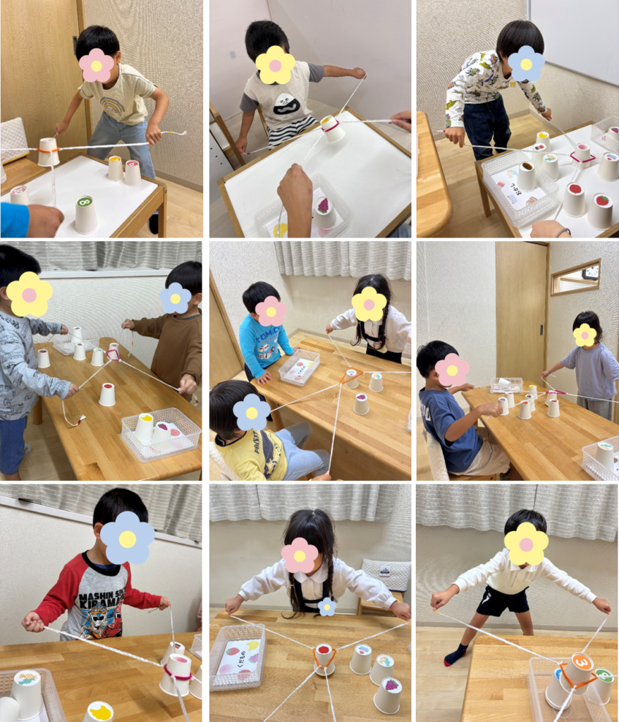 なかよしコースでは、お友だちと力を合わせて楽しむ「クレーンゲーム」に挑戦しました。ひもを引っ張って真ん中のゴムを広げ、紙コップをそっとつかんでカゴの中に落とします🎯紙コップにはイラストや数字が書かれており、種類ごとに分けてカゴに入れたり、数字の順番に重ねたりするルールで遊びました。