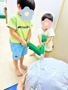 なかよしコースでは、お友だちと力を合わせて楽しむ「クレーンゲーム」に挑戦しました。ひもを引っ張って真ん中のゴムを広げ、紙コップをそっとつかんでカゴの中に落とします🎯紙コップにはイラストや数字が書かれており、種類ごとに分けてカゴに入れたり、数字の順番に重ねたりするルールで遊びました。