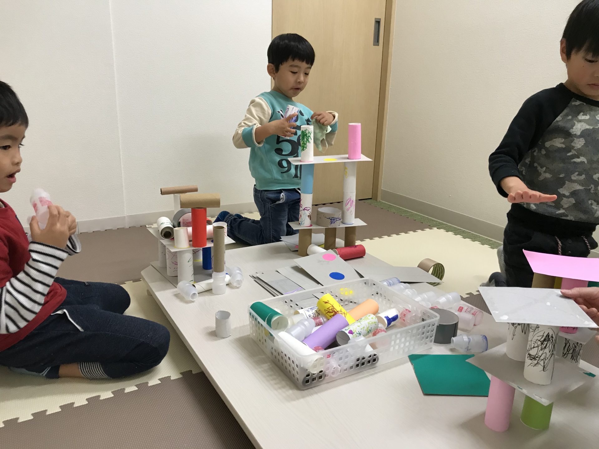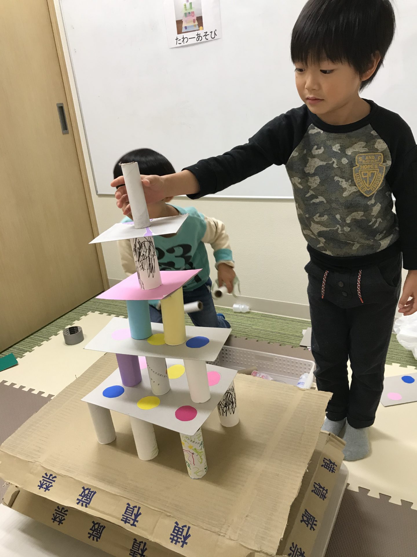 タワーあそび 2020 12/25 活動報告 2020年11月30日2020年12月25日 廃材とボール紙でタワー遊びをしました。 タワーが高くなってくるとバランスが難しく倒れないように慎重にのせたり、 倒れても「もう一回」と言いながらやり直して繰り返し遊んでいました。 筒を縦だけではなく、横にして積んだりと色々と工夫をしていました。 活動報告 よかったらシェアしてね! URLをコピーしました! URLをコピーしました! 秋を感じる活動 サーキット遊び 関連記事 おおきなかぶごっこ 2025年11月15日 クレーンゲーム 2025年11月15日 バグキャッチャー、はさみ 2025年10月15日 カーペンターブロック 2025年10月15日 なつまつり 2025年9月15日 夏祭り 2025年9月15日 水遊び、プール 2025年8月12日 水遊び、プール 2025年8月12日