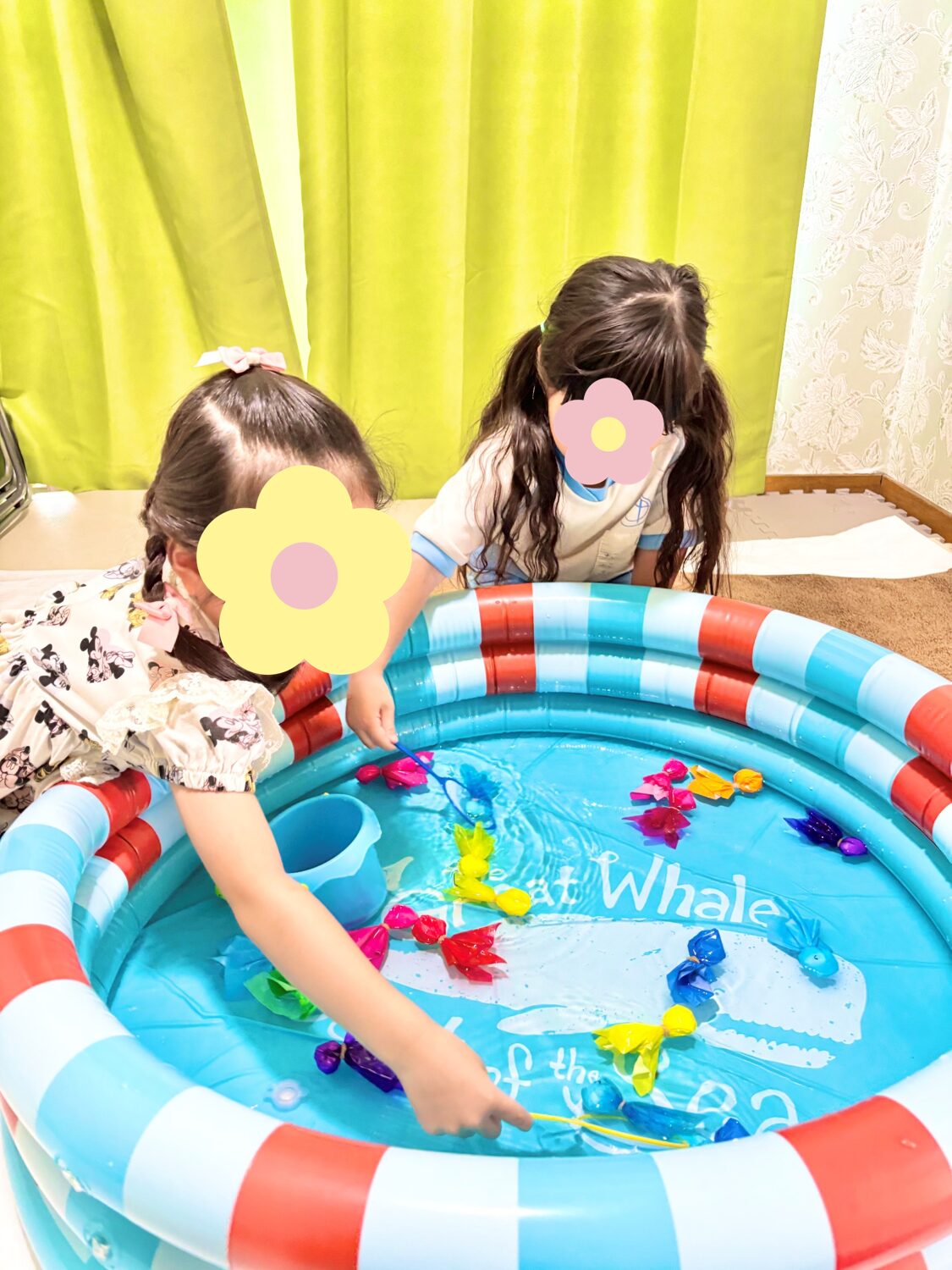 なかよしコースでも夏祭りを楽しみました。風船てっぽうでの的当ては一見簡単そうに見えますが意外と両手操作の力加減が難しく、たくさん引っ張った方が強く飛ぶので手に力を入れると、紙コップを支える反対の手にも力が入ってしまい、上手く飛ばず苦戦する様子もありましたが、何度も何度も力加減のコントロールを練習しながら挑戦する姿が見られました。おやつ釣りでは欲しいおやつに狙いを定め、「うまく釣れるかな…」とわくわくしながら釣り糸を巻き上げ、指先や協調動作のトレーニングを頑張りました。