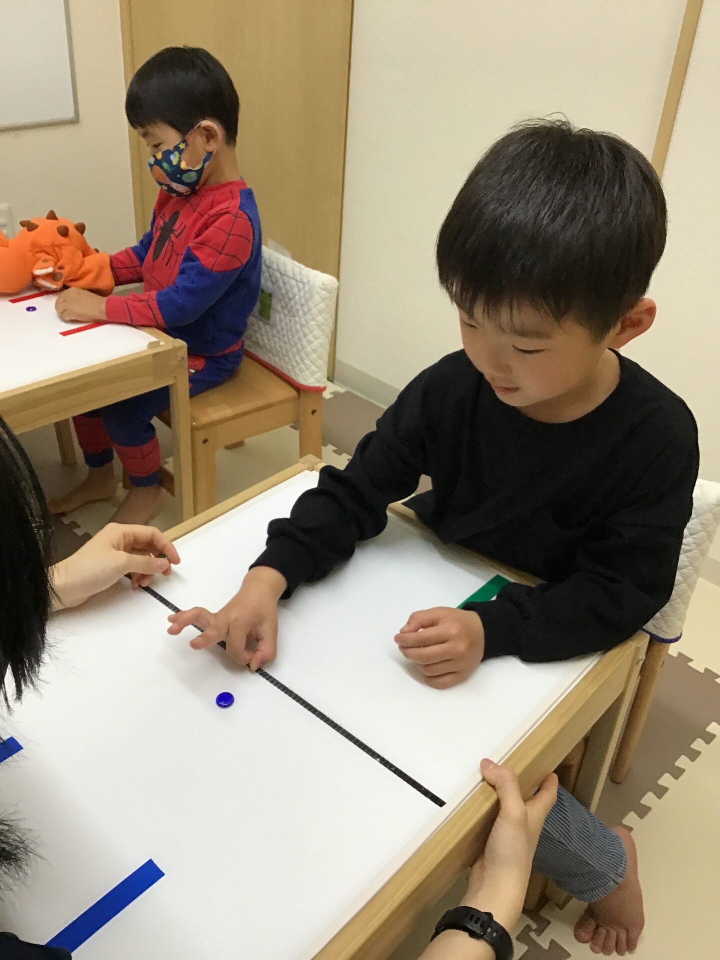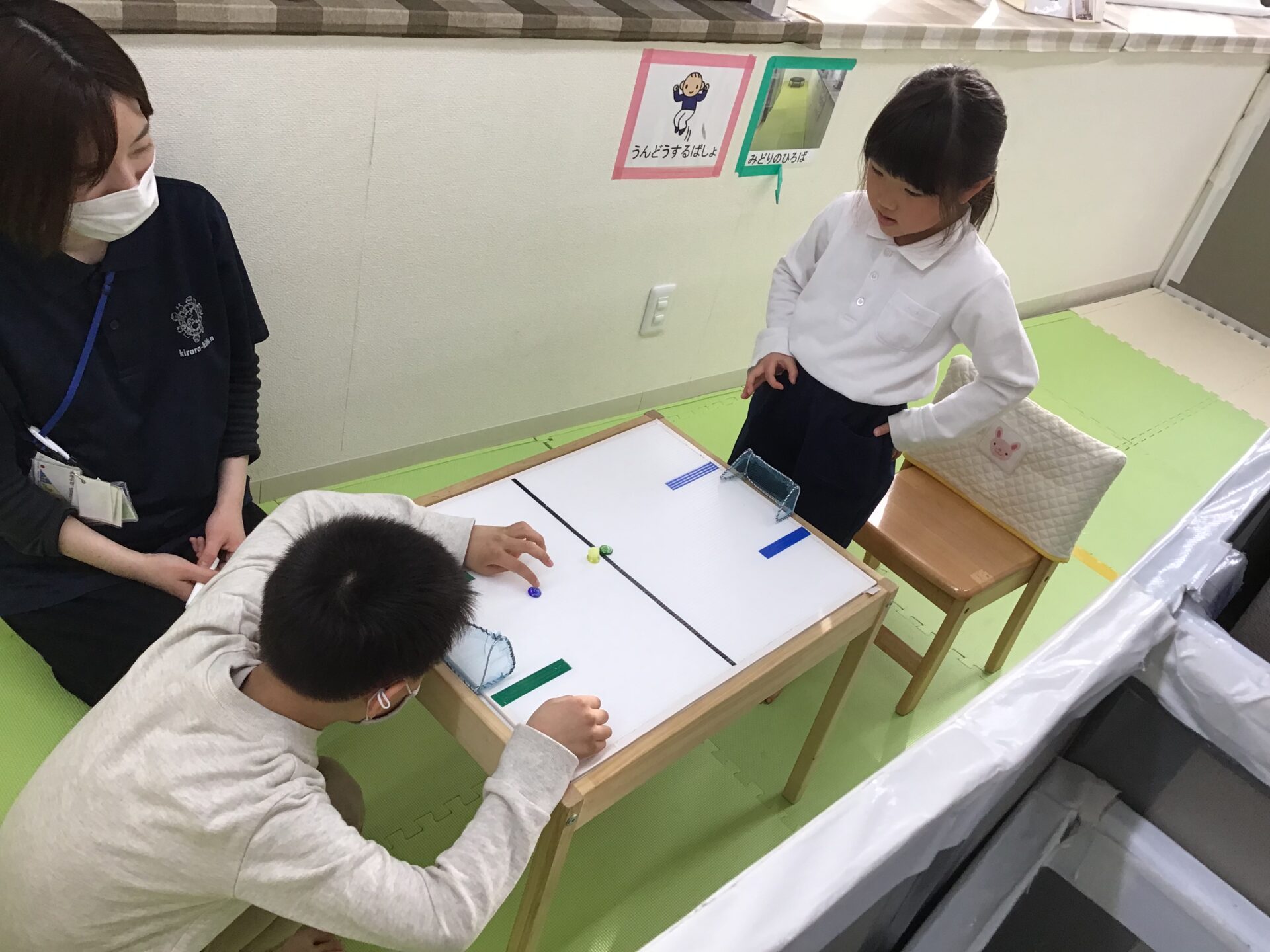 おはじきを指先ではじいて 前にある的に当てたり、ゴールの中に入れてサッカーを友達と対戦したりしました。おはじきを強くはじくと遠くまで飛んで行ったり、弱いと飛ばなかったりして力加減が難しかったようですが、数回していくうちに はじき方もわかり、的に当たると「やったー!」と大喜びでした。また、友達との対戦は相手のゴールに入ると「今、〇対〇?」と確認したり「次はがんばるわ!」とやり取りをしながら楽しんでいました。