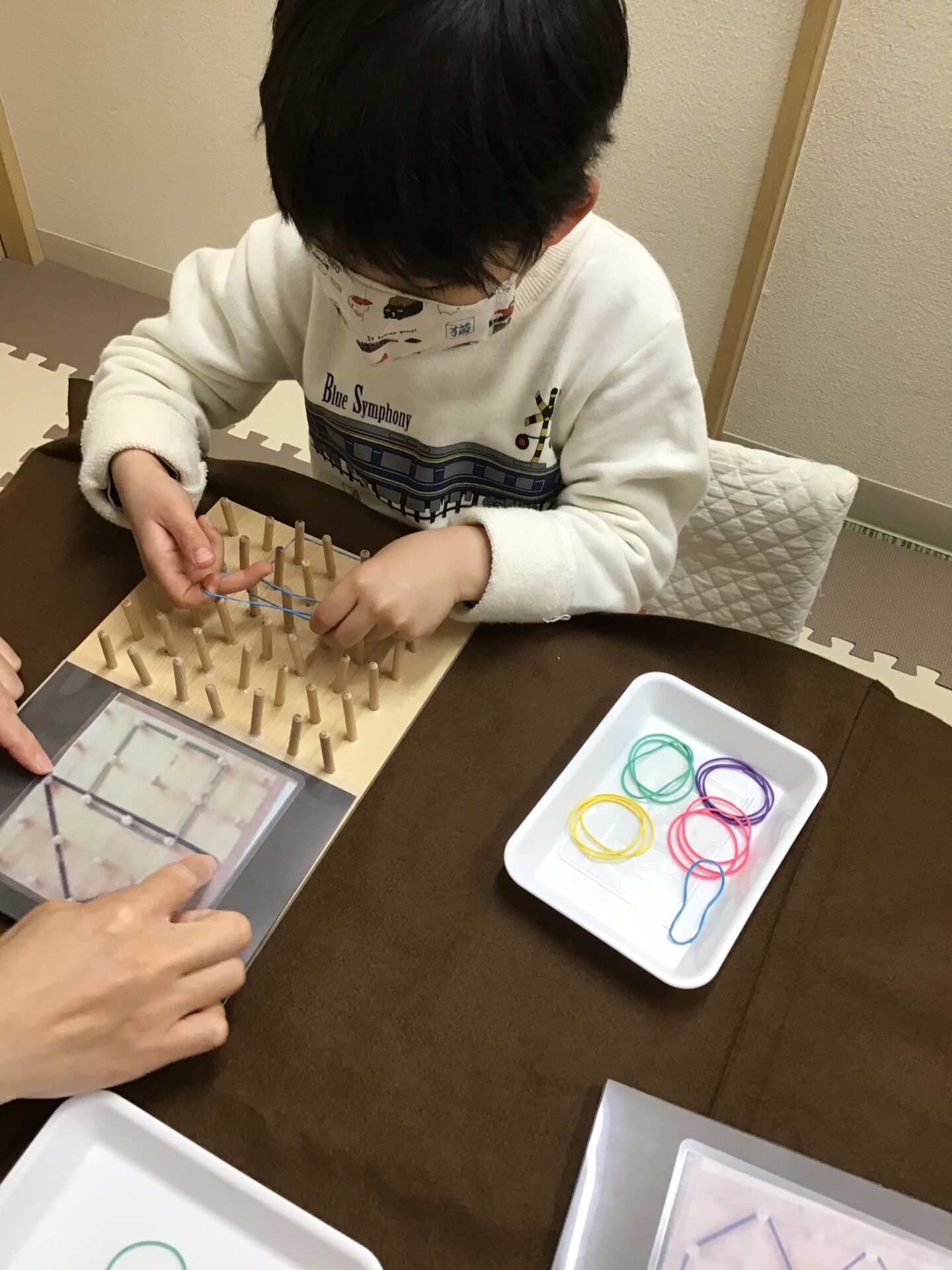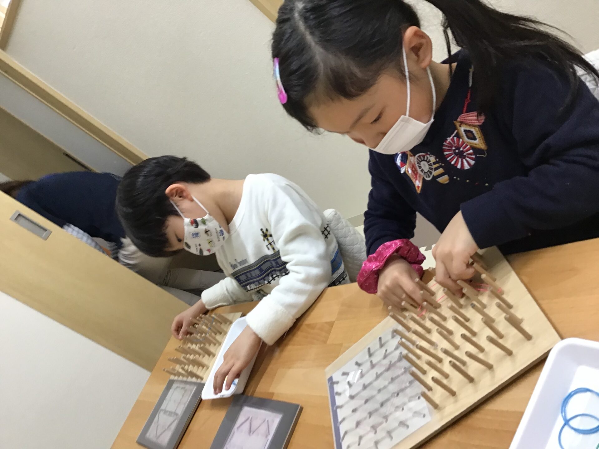 ゴムを指先で伸ばし縦、横、斜めに見本を見ながら、棒に引っ掛けて模様を作っていきました。斜めに掛けるのが難しくゴムが外れてしまい何回もやり直してできた時は嬉しそうでした。
