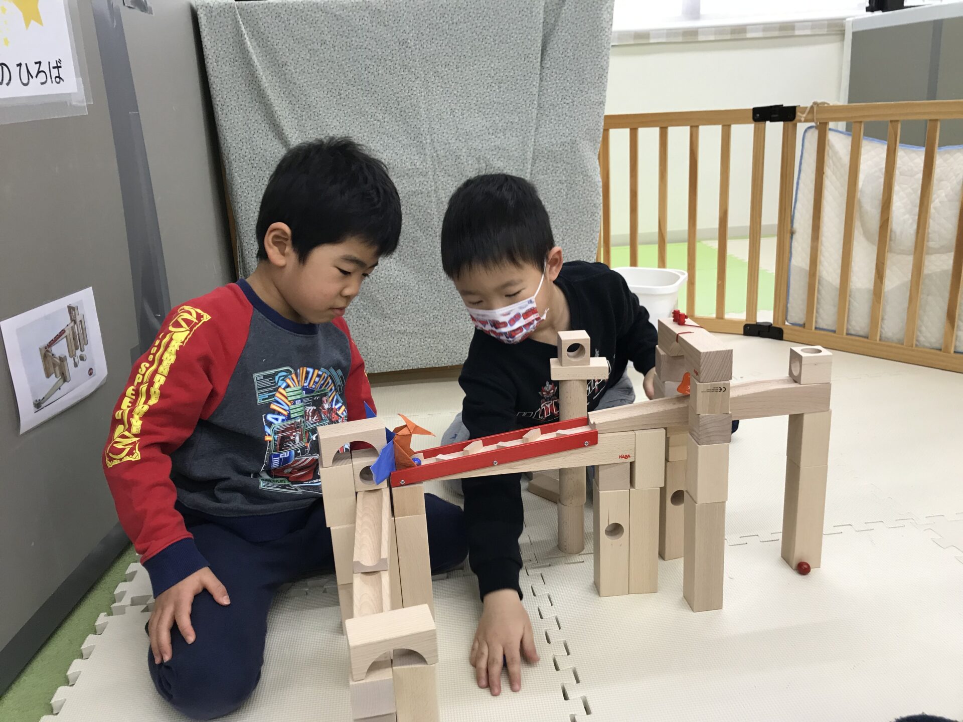 子どもたち数人で「ここに積み木を置くわ」や「ここはどうしよう?」と相談しながら作っています。途中で崩れても「もう1回しよう!」と友達と協力して作り、「次は〇〇ちゃん」と交代で玉を転がして遊んでいます。