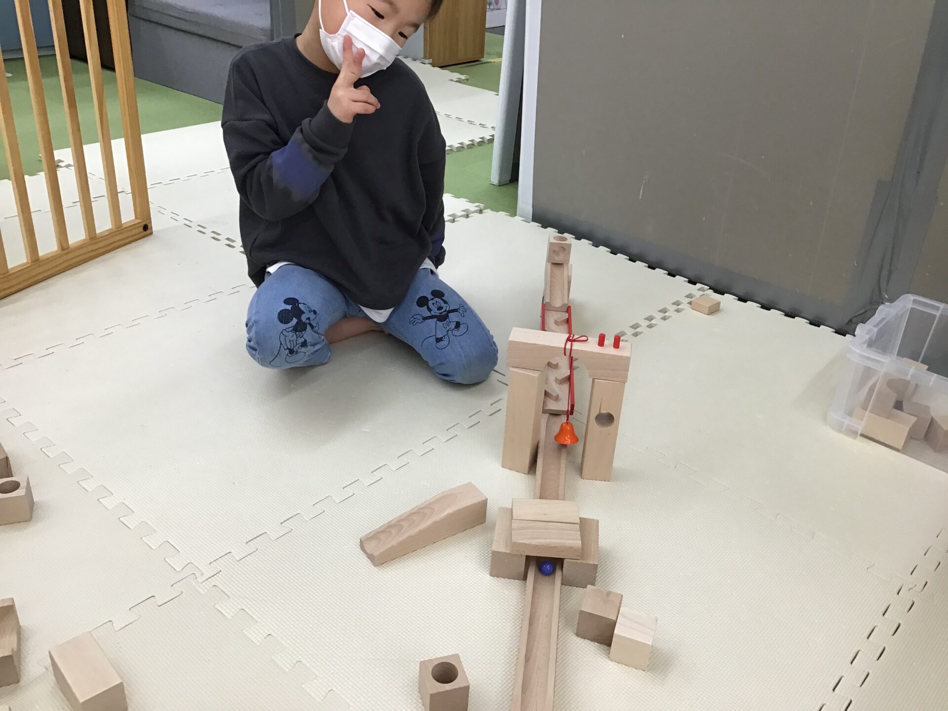 玉を転がしてベルが鳴るように組み立てています。途中で角度を変えて曲がるようにすると玉が飛び出る時もあり、積み木で壁を作って工夫していました。最後まで転がると「やったー!」と大喜びでした。