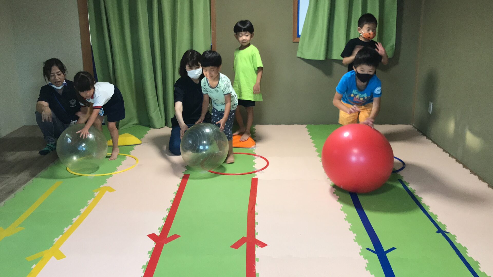 ボールの大小で遊び方が変わりますがバランス感覚が養われたり、運動神経や協調性が育ちます。